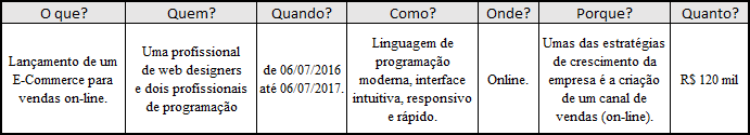 Então, Voilà, habemus uma ótima ferramenta de planejamento de ações. Assim, conseguimos descrever todas as informações vitais de um plano ou projeto. Tudo isso de forma simples, prática e rápida. Com pouco ou nenhum treinamento, qualquer colaborador era capaz de aplicá-la ou seguir suas instruções!